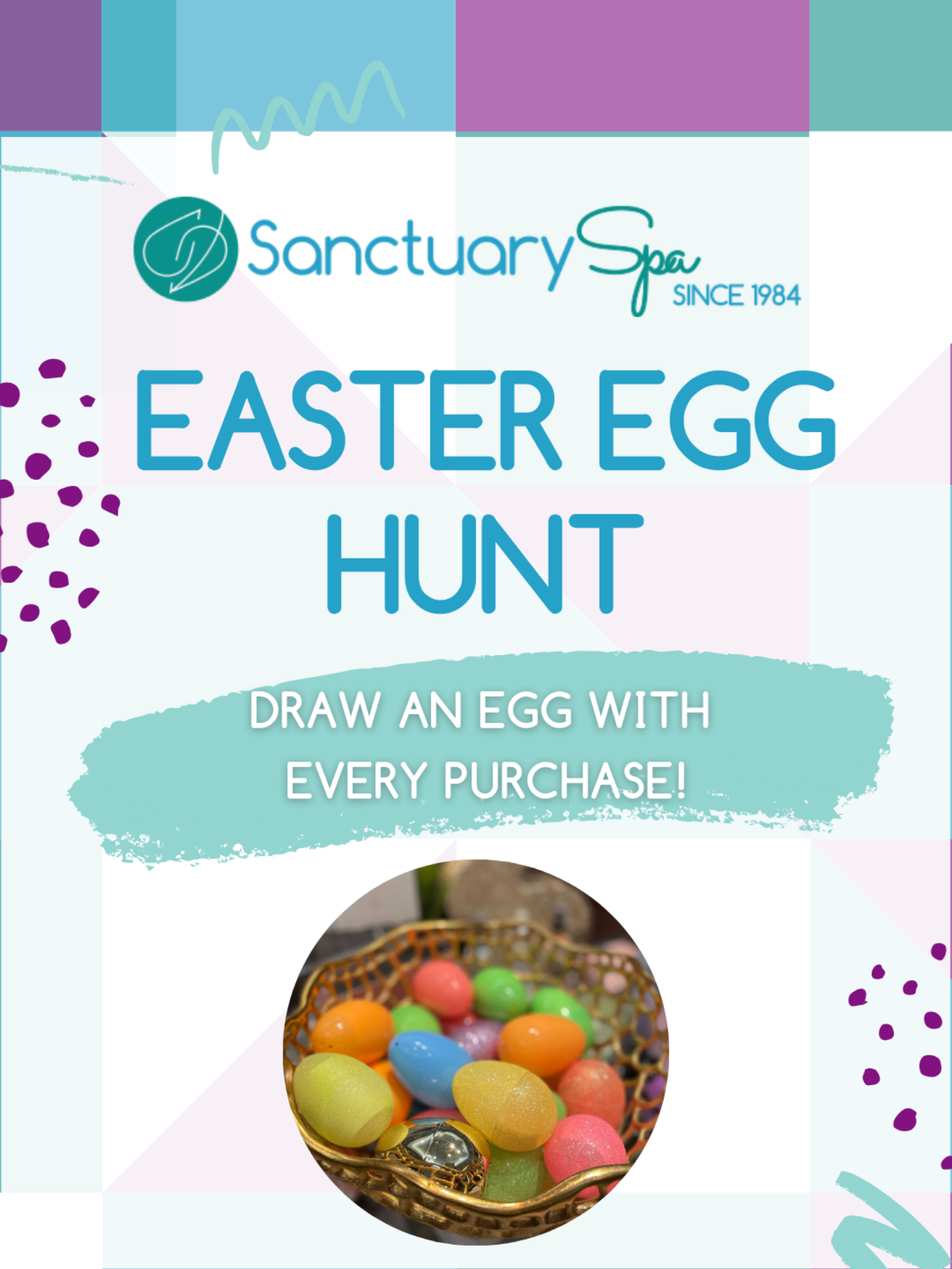 From April 2 through April 5, celebrate Easter week at Sanctuary Spa with a little extra joy and a whole lot of surprise. With every in‑store purchase, you’ll be invited to draw an Easter egg. Each egg will reveal a mystery prize, ranging from exclusive discounts to complimentary enhancements or services you can enjoy during a future visit.